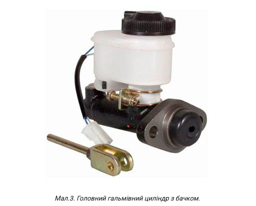 wheel or working brake cylinders, which, under the pressure of the hydraulic fluid, press the brake shoes against the inner surface of the brake drum. They are activated by the brake pedal through the master brake cylinder (Fig. 3). There may be one or two working brake cylinders; two cylinders are used in a duplex brake mechanism, also known as a “twin leading shoe” brake.