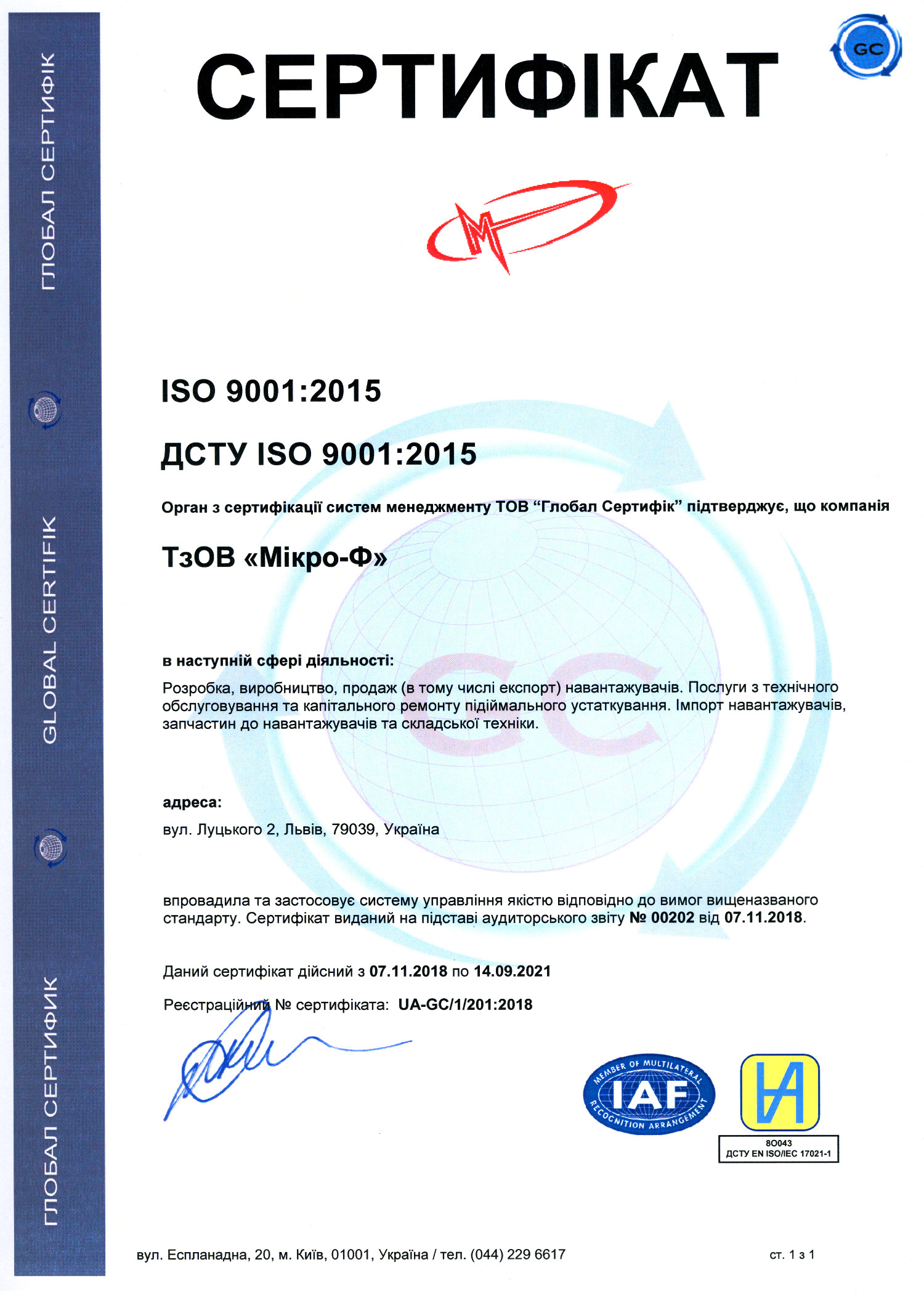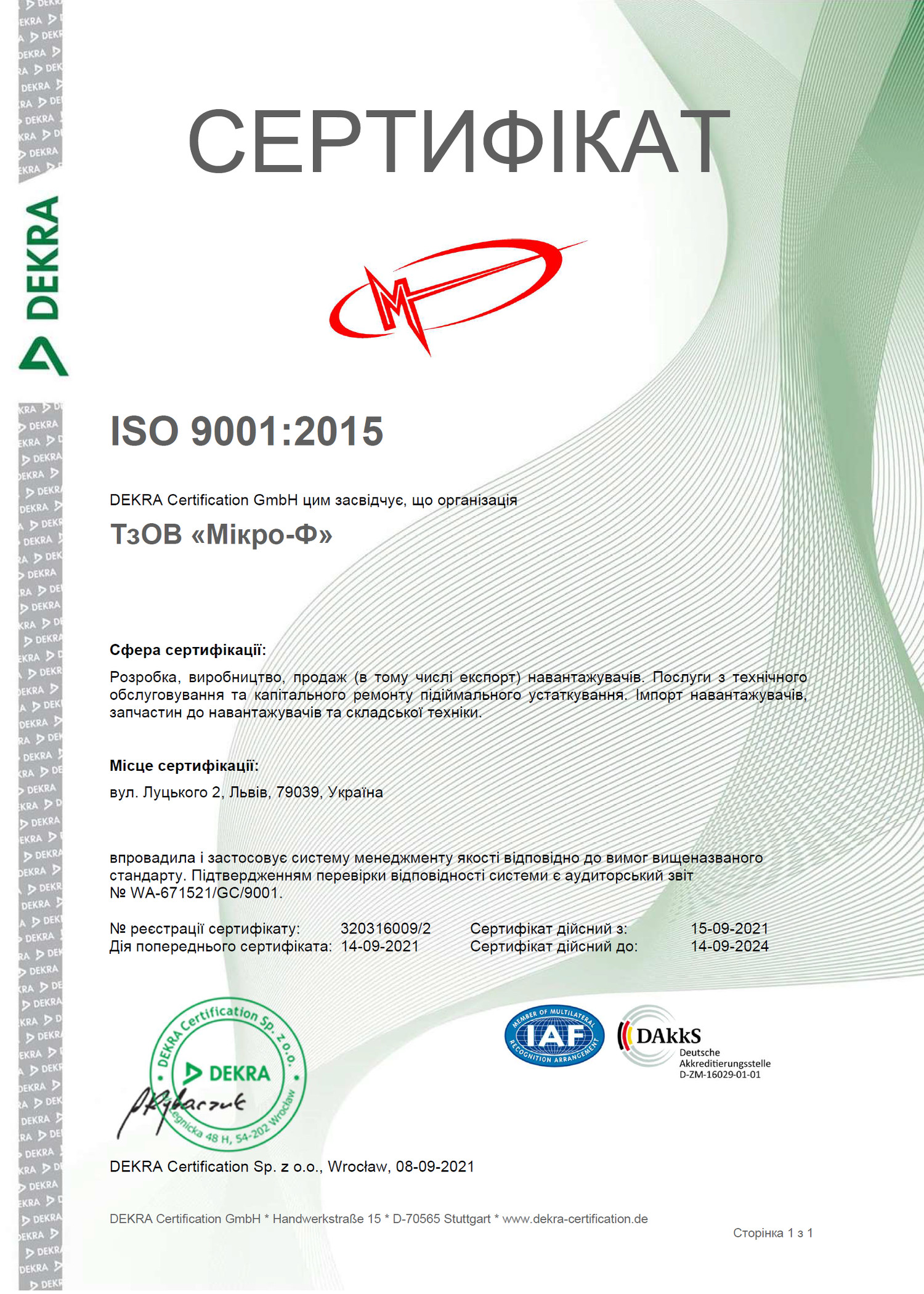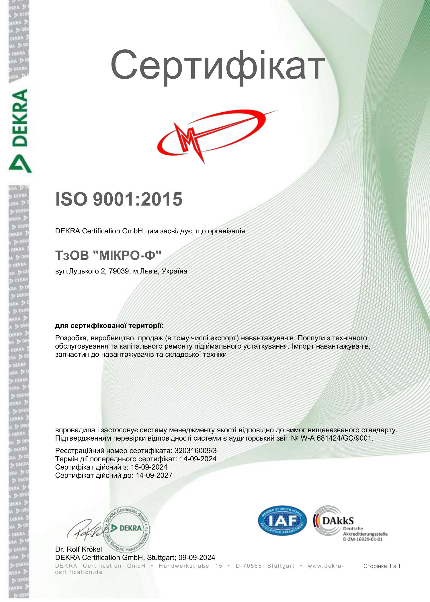 Вся продукція, яка представлена товариством Мікро-Ф сертифікована в країні виробника, а також підтверджена сертифікатами відповідності Державної системи сертифікації УкрСЕПРО.