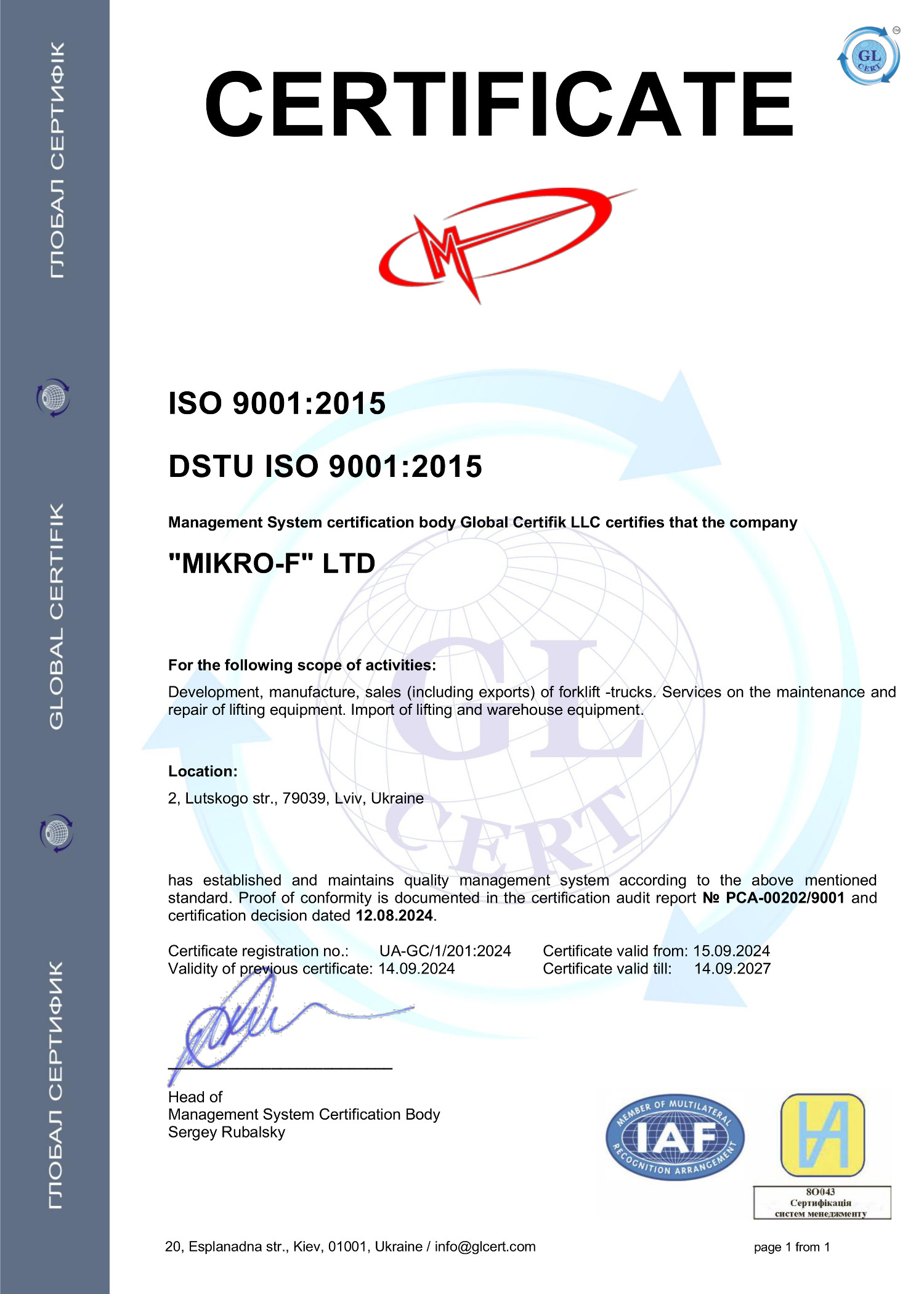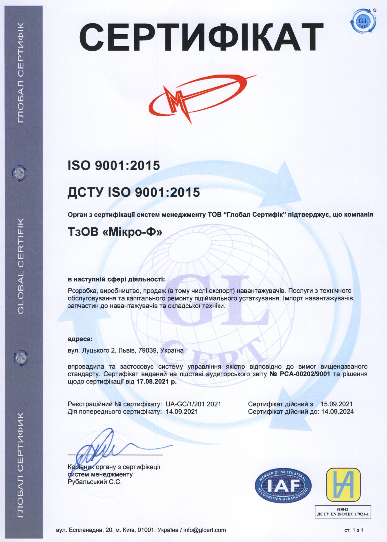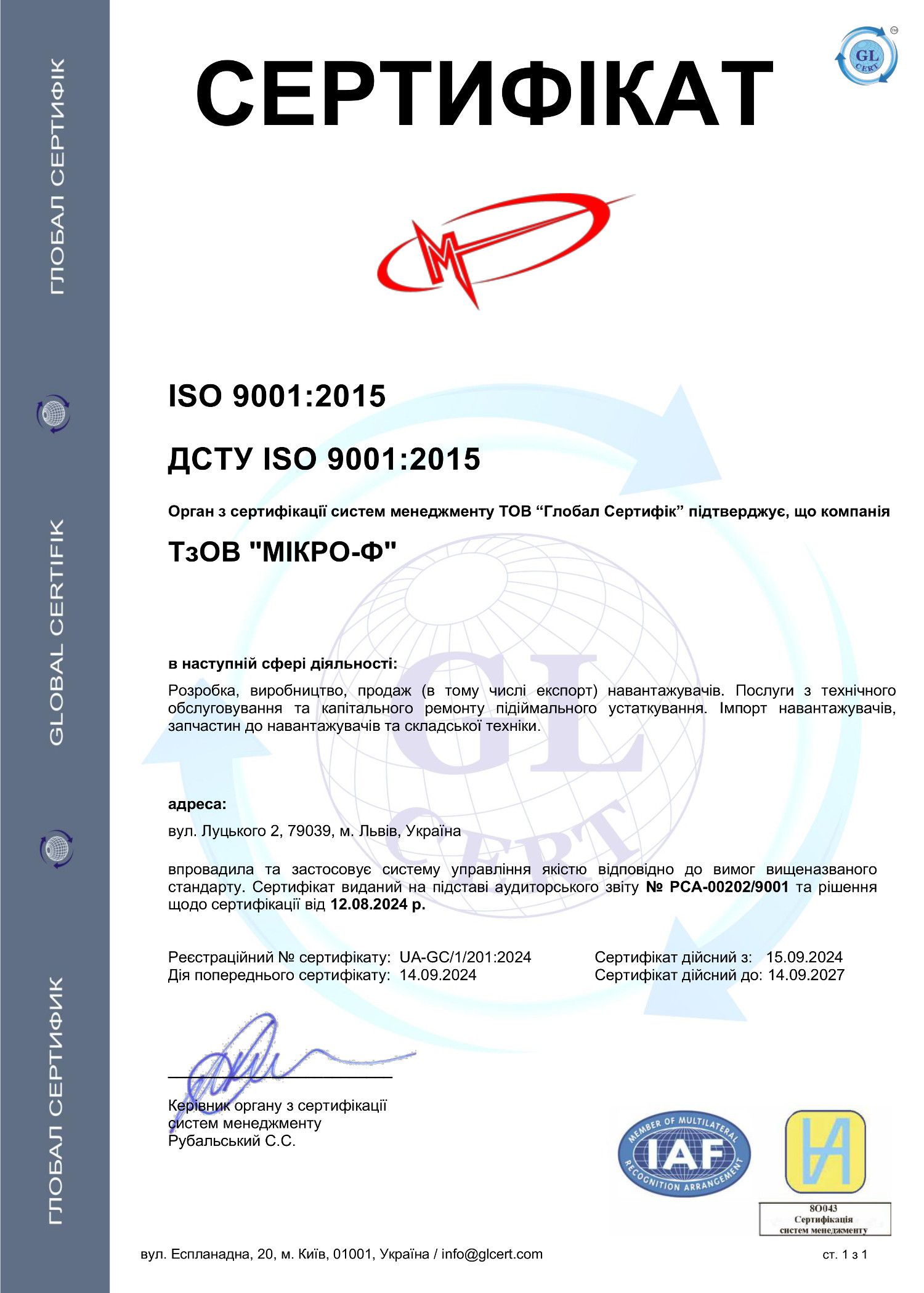 Вся продукція, яка представлена товариством Мікро-Ф сертифікована в країні виробника, а також підтверджена сертифікатами відповідності Державної системи сертифікації УкрСЕПРО.